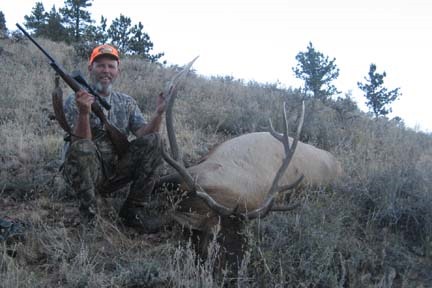 So I resumed my awkward shooting position and again began working on my breathing. It was soon apparent my breathing and excitement would not be totally controlled so I took my shot. The hit had little appearance of hitting the bull though I knew my aim was on target. Knowing a single shot kill on a bull elk was rare, I shot again. My second shot was followed closely by one from Barb, who it turned out was shooting my bull as well. Down he went!